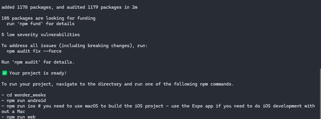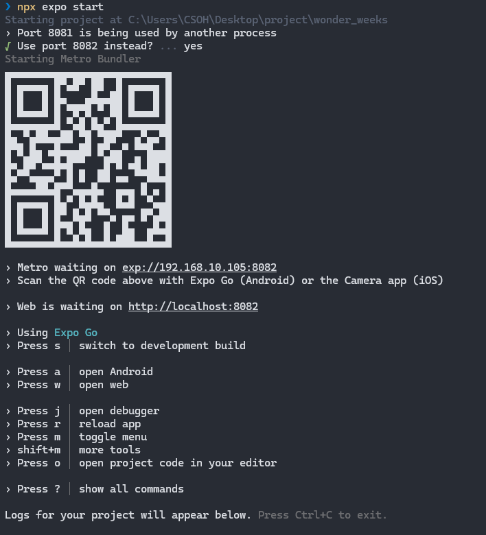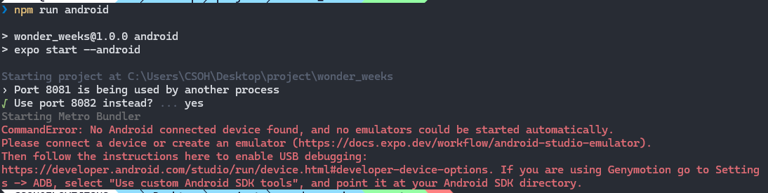 cd wonder_weeks npm run android필자의 경우 안드로이드 폰을 사용하고 있어서 android로 실행했다.
