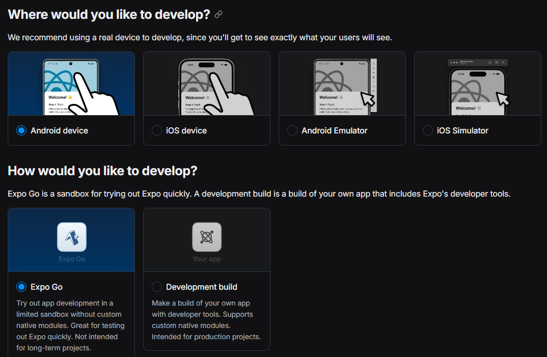 본인 기기에 맞는 옵션을 선택하자. 옵션에 따른 설명이 하단에 나온다. Expo를 설치하라고 하니 설치하자.