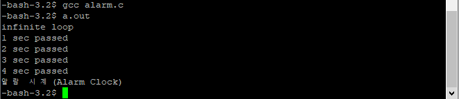 #include <unistd.h> #include <stdio.h> /* 알람 시그널을 보여주는 프로그램 */ int main( ) { int sec = 0; alarm(5); // 5초뒤 알람 실행 printf("infinite loop \n"); while (1) { // 반복문 sleep(1); // 1초대기 printf("%d sec passed\n", ++sec); } printf("not run \n"); }