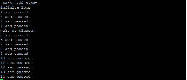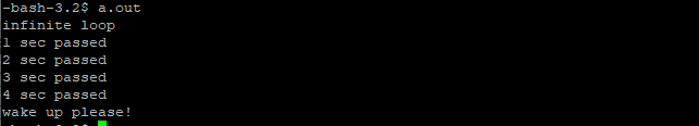 #include <stdio.h> #include <stdlib.h> #include <unistd.h> #include <signal.h> void alarmHandler(); /* 알람 시그널을 처리한다. */ int main( ) { int sec = 0; signal(SIGALRM,alarmHandler); alarm(5); /* 알람 시간 설정 */ printf("infinite loop \n"); while (1) { sleep(1); printf("%d sec passed \n", ++sec); } printf("실행되지 않음 \n"); } void alarmHandler() { printf("wake up please!\n"); exit(1); }