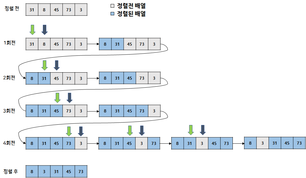 #include <iostream> using namespace std; int main (){ int i, j, temp; int ary[5] = {31, 8, 45, 73, 3}; for(int i = 1; i < 5; i++){ j = i; while(ary[j-1] > ary[j]){ temp = ary[j-1]; ary[j-1] = ary[j]; ary[j] = temp; j--; } } for(int i = 0 ; i < 5 ; i ++) cout << ary[i] << ' '; }정리 및 느낀 점