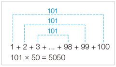 앞의 숫자와 뒤의 숫자를 더하면 모든 쌍의 합이 101이나 오며, 그 개수는 전체 개수의 절반인 50개가 된다는 점을 발견하여 풀어냈다.
