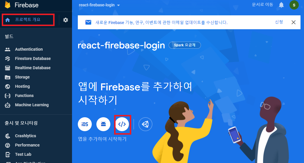 우측 상단에 프로젝트 개요를 클릭하면, 우측 화면에 추가할 앱이 나온다. 우리는 웹으로 만들 예정이므로 </> 버튼을 클릭하여 생성하자.