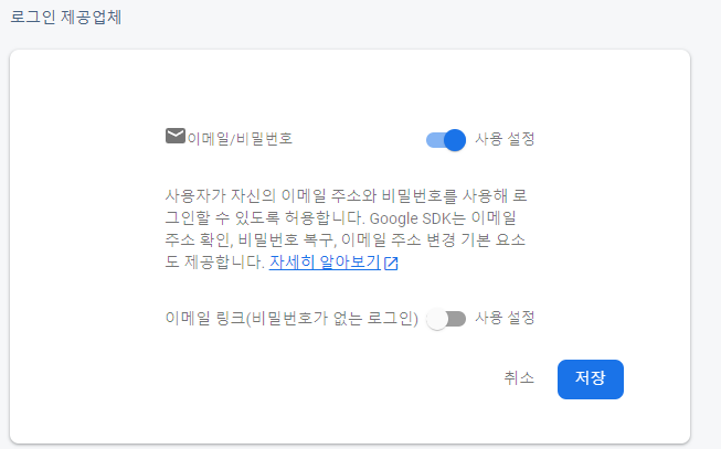 비밀번호가 없는 로그인 토글은 꺼주자. 비밀번호가 없는 로그인도 지원한다는 점만 알아두자! firebase는 정말 최고다.