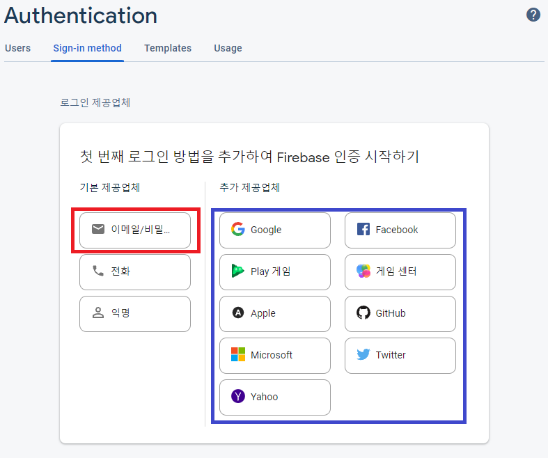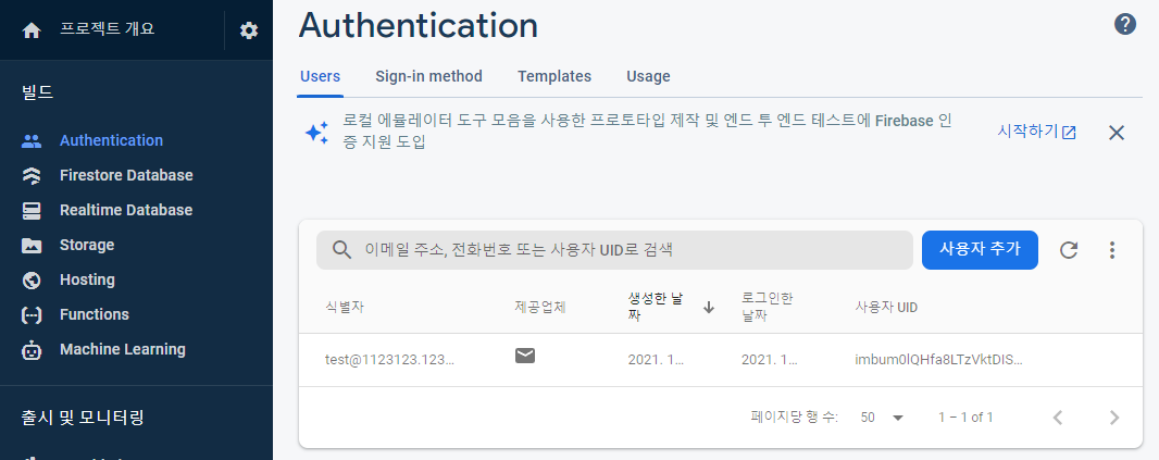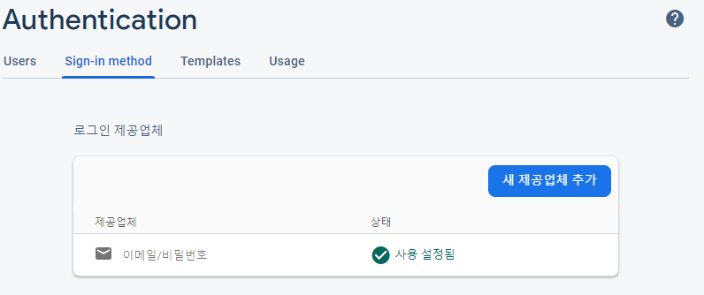 기본 제공업체의 이메일/비밀번호 버튼을 클릭하자, 추가 제공업체에서 제공하는 구글 로그인, fb로그인 등은 추후에 다뤄볼 예정이다.