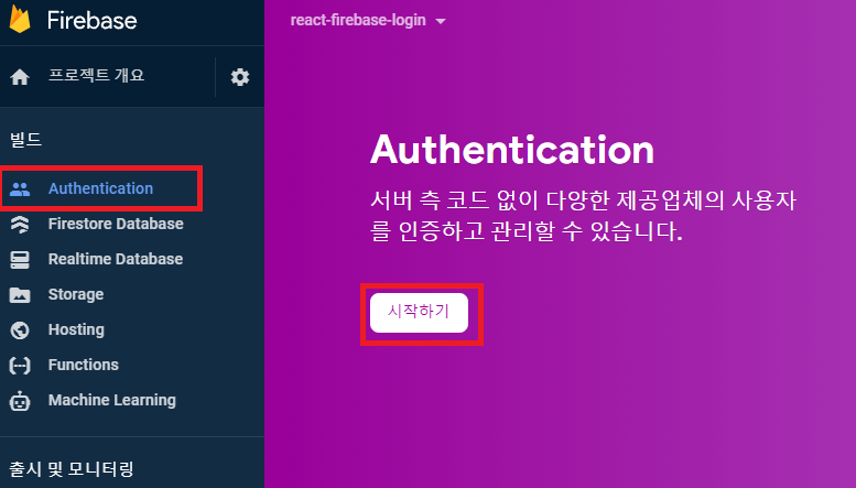 좌측 상단의 Authentication을 클릭 후 우측에 나오는 페이지의 시작하기 버튼을 클릭하자.