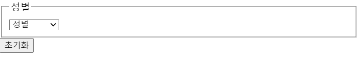 <!DOCTYPE html> <html lang="en"> <head> <meta charset="UTF-8" /> <meta name="viewport" content="width=device-width, initial-scale=1.0" /> <meta http-equiv="X-UA-Compatible" content="ie=edge" /> <title>Static Template</title> </head> <body> <form> <fieldset> <legend>성별</legend> <div> <select name="sex"> <option value="">성별</option> <option value="man"> 남자 </option> <option value="girl"> 여자 </option> <option value="none"> 선택 안함 </option> </select> </div> </fieldset> <input type="reset" value="초기화" /> </form> </body> </html>