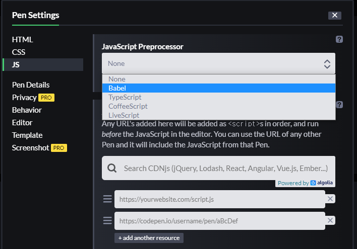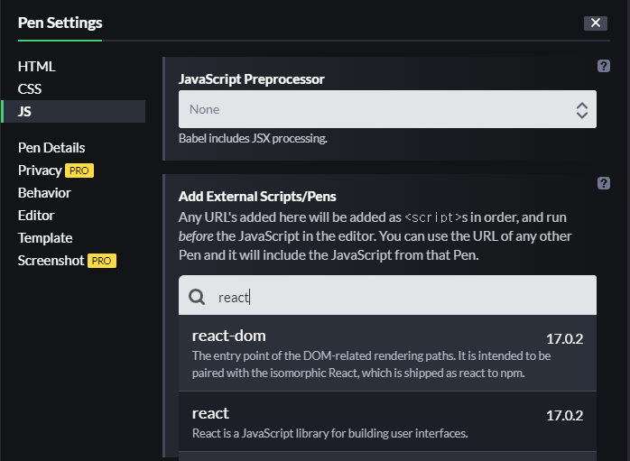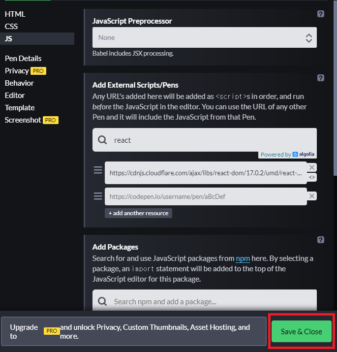 React는 babel로 변환해줘야 하므로 Preprocessor를 babel로 맞춰주고 react, react-dom을 추가해주면 된다. 추가가 완료되면 하단의 save & close 버튼을 클릭하여 종료 후에 나가주면 된다.