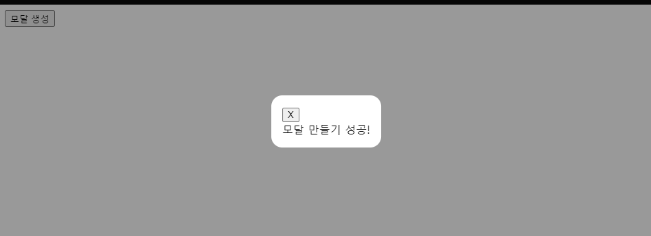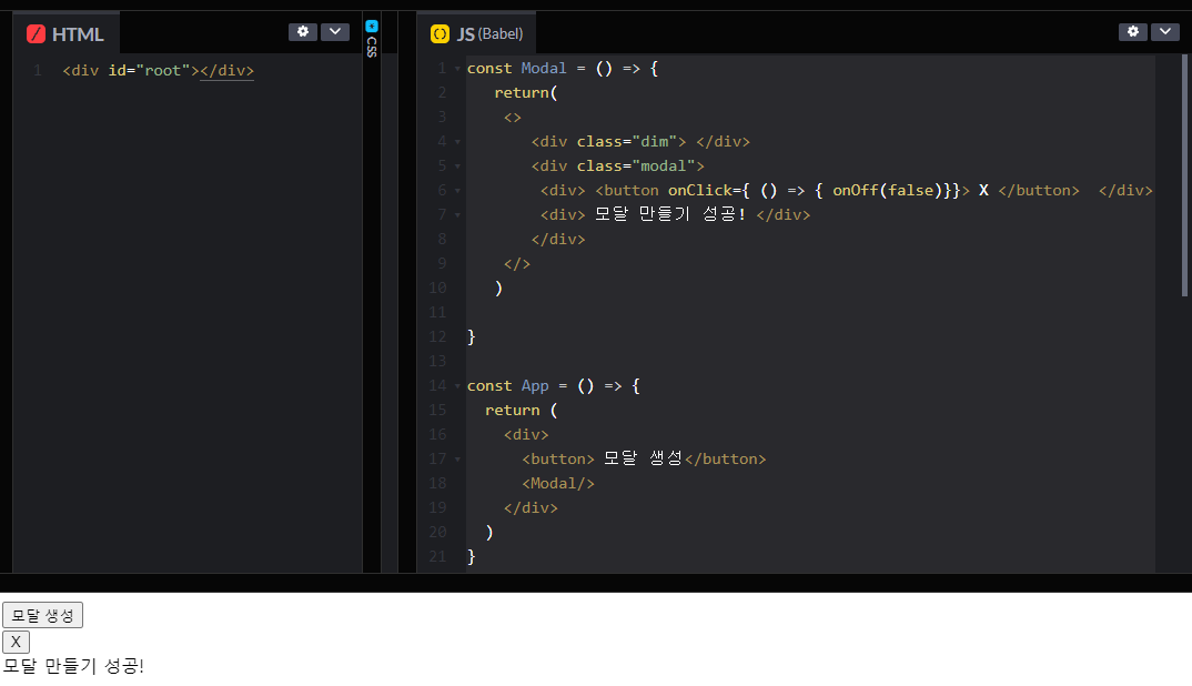 생성 </button> () => { return( <> <div class="dim"> </div> <div class="modal"> <div> <button onClick={ () => { onOff(false)}}> X </button> </div> <div> 모달 만들기 성공! </div> </div> </> ) } const App = () => { return ( <div> <button> 모달 생성</button> <Modal/> </div> ) } ReactDOM.render( <App/> , document.getElementById('root') ) 간단하게 모달 구조를 만들어보았다.
