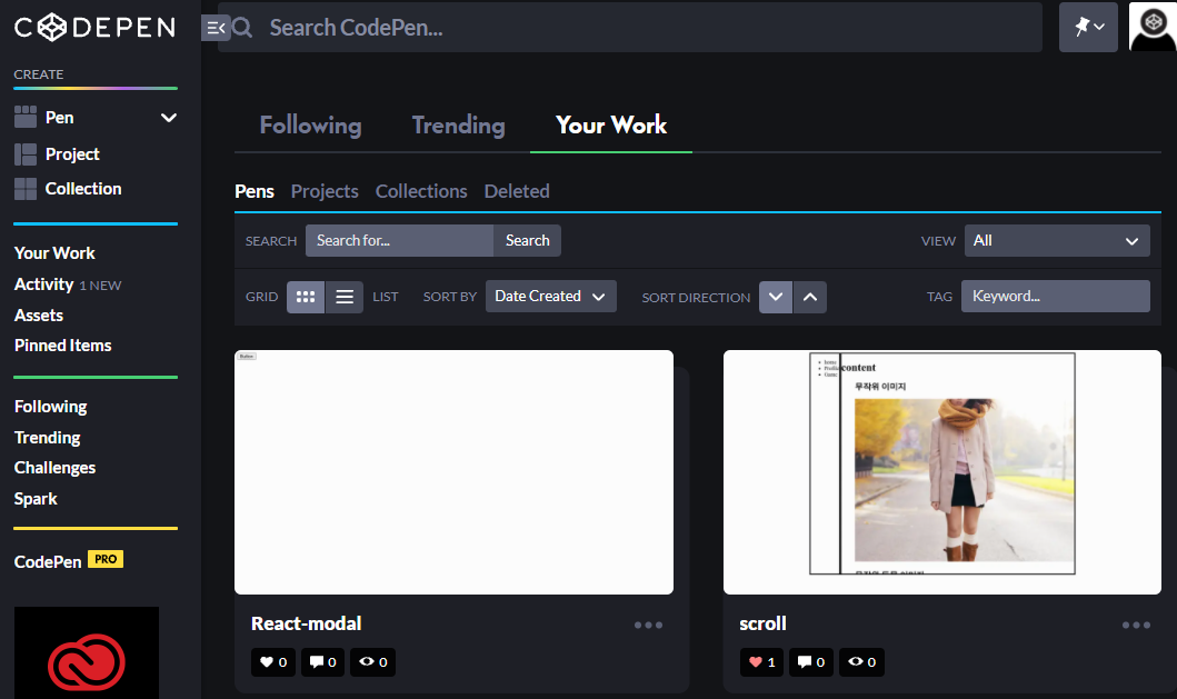 https://codepen.io/ 링크 따라 들어가면 다음과 같은 화면을 볼수 있다