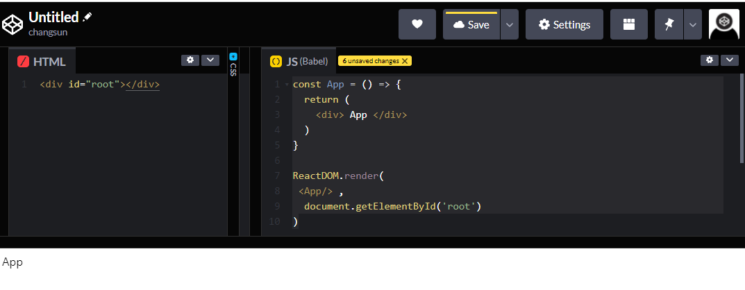 const App = () => { return ( <div> App </div> ) } ReactDOM.render( <App/> , document.getElementById('root') ) App Component가 렌더링 되는 모습을 확인할 수 있다.