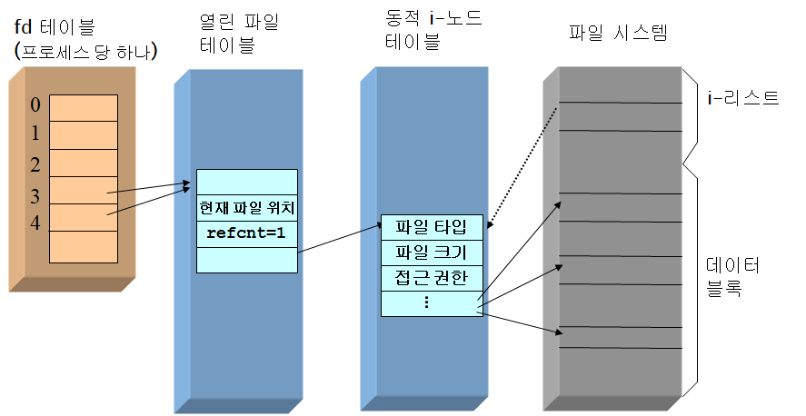 - fd 테이블 : 열린 파일의 엔트리를 가리킨다