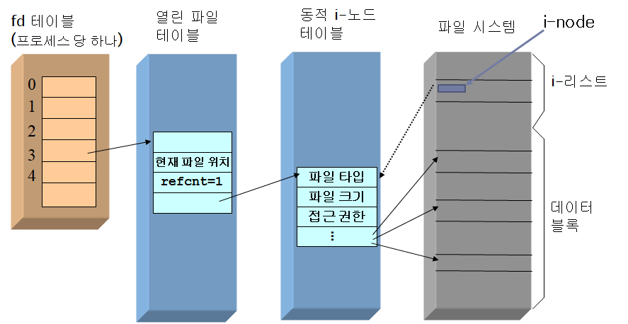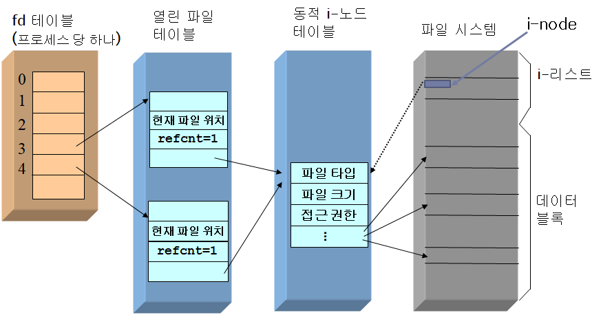- i-node 테이블 : open 된 파일들의 i-node를 저장하는 테이블