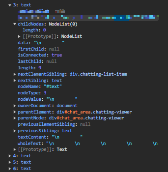채팅을 출력하는 DOM의 Children을 보면 이상한 점이 없다. 그러나 ChildNodes를 살펴보자. text Node가 사라지지 않고 남아 있는 것을 볼 수 있다. 남아있는 Text Node는 개행문자였다. nodevalue의 값을 보니 "\n " 으로 들어가고 있었다. 개행 문자가 있어서 영역을 차지할 것도 하지만, 신기하게도 UI 영역에서 개행이 있거나 하는 문제는 없었다.