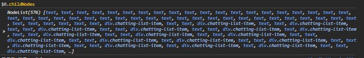 채팅을 출력하는 DOM의 Children을 보면 이상한 점이 없다. 그러나 ChildNodes를 살펴보자. text Node가 사라지지 않고 남아 있는 것을 볼 수 있다. 남아있는 Text Node는 개행문자였다. nodevalue의 값을 보니 "\n " 으로 들어가고 있었다. 개행 문자가 있어서 영역을 차지할 것도 하지만, 신기하게도 UI 영역에서 개행이 있거나 하는 문제는 없었다.
